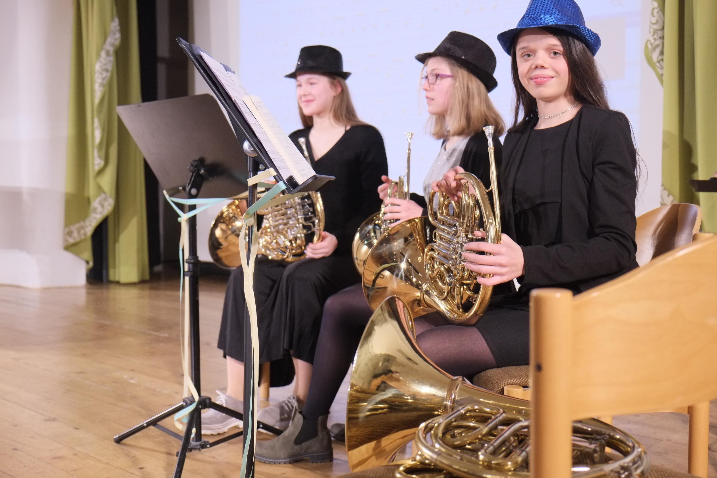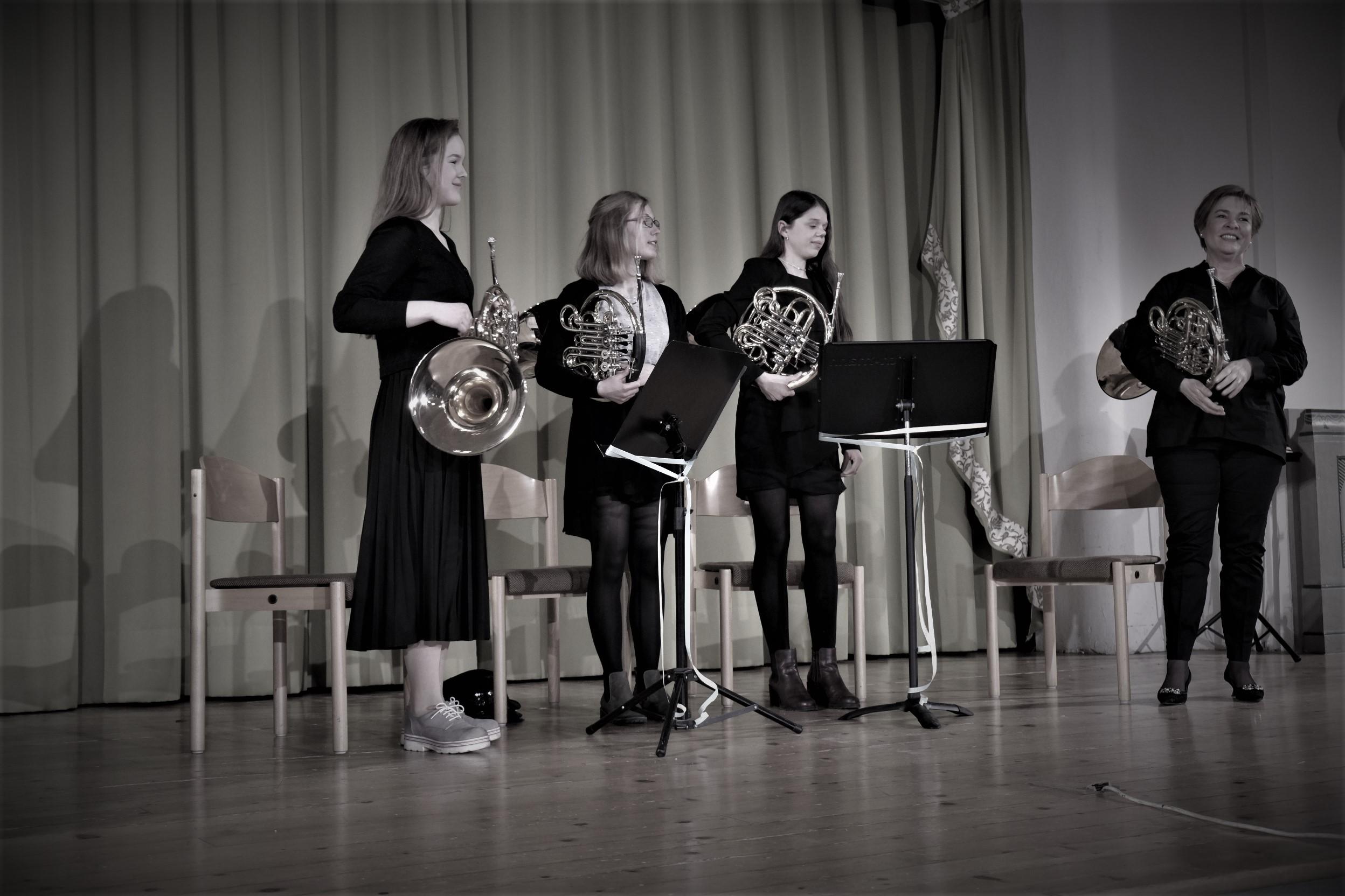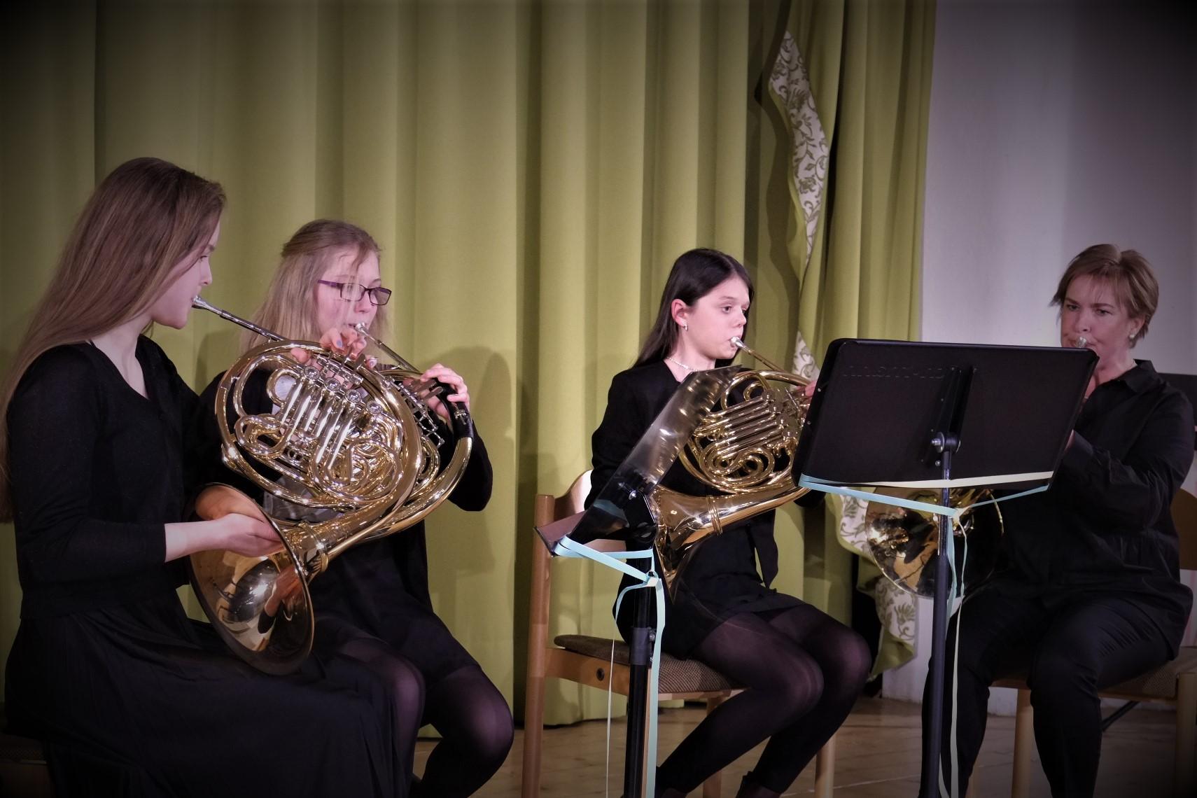 Zum Abschluss spielte ein Hornquartett einige Sätze aus „Kleine Tafelmusik für 3 Hörner“. Als fulminantes Finale trug es einen Kanon von Mozart „O du eselhafter Martin“ vor, wobei das zahlreiche Publikum mitsang. Dies passte zum aktuellen Karneval, wobei auch die Notenständer für das Konzert passend zum Fasching dekoriert worden waren.