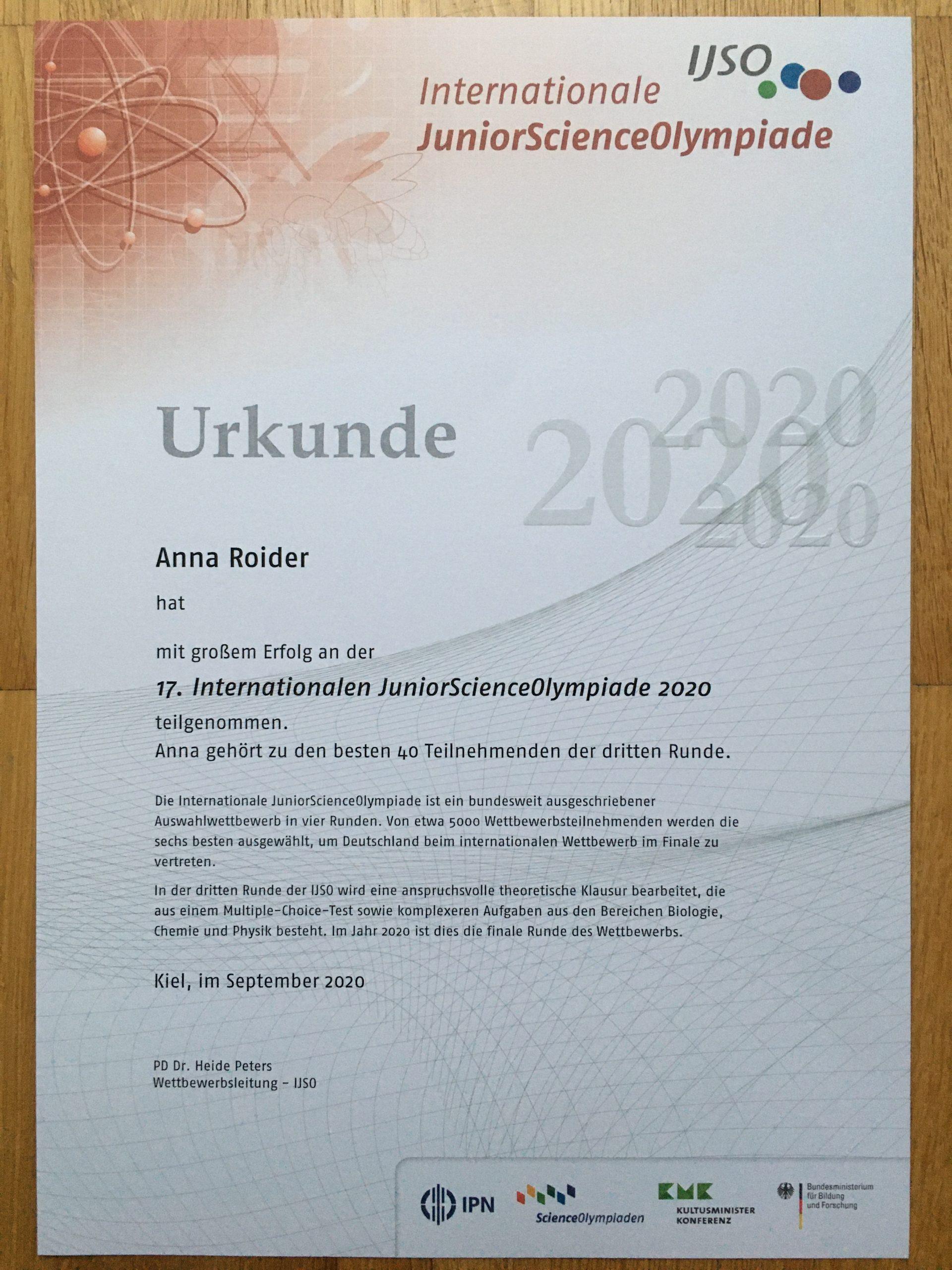 Ich habe per Post nicht nur eine Urkunde, sondern auch eine Medaille, einen Schal mit dem Logo der Olympiade und das Buch „BINAS: handbook for the natural sciences and mathematics“ erhalten, was mich sehr gefreut hat.