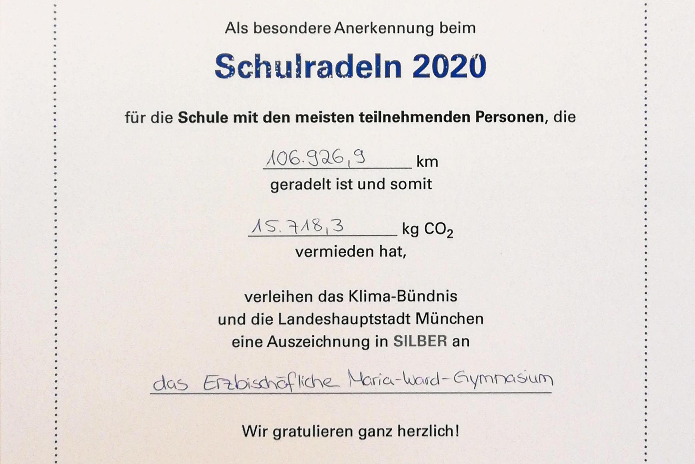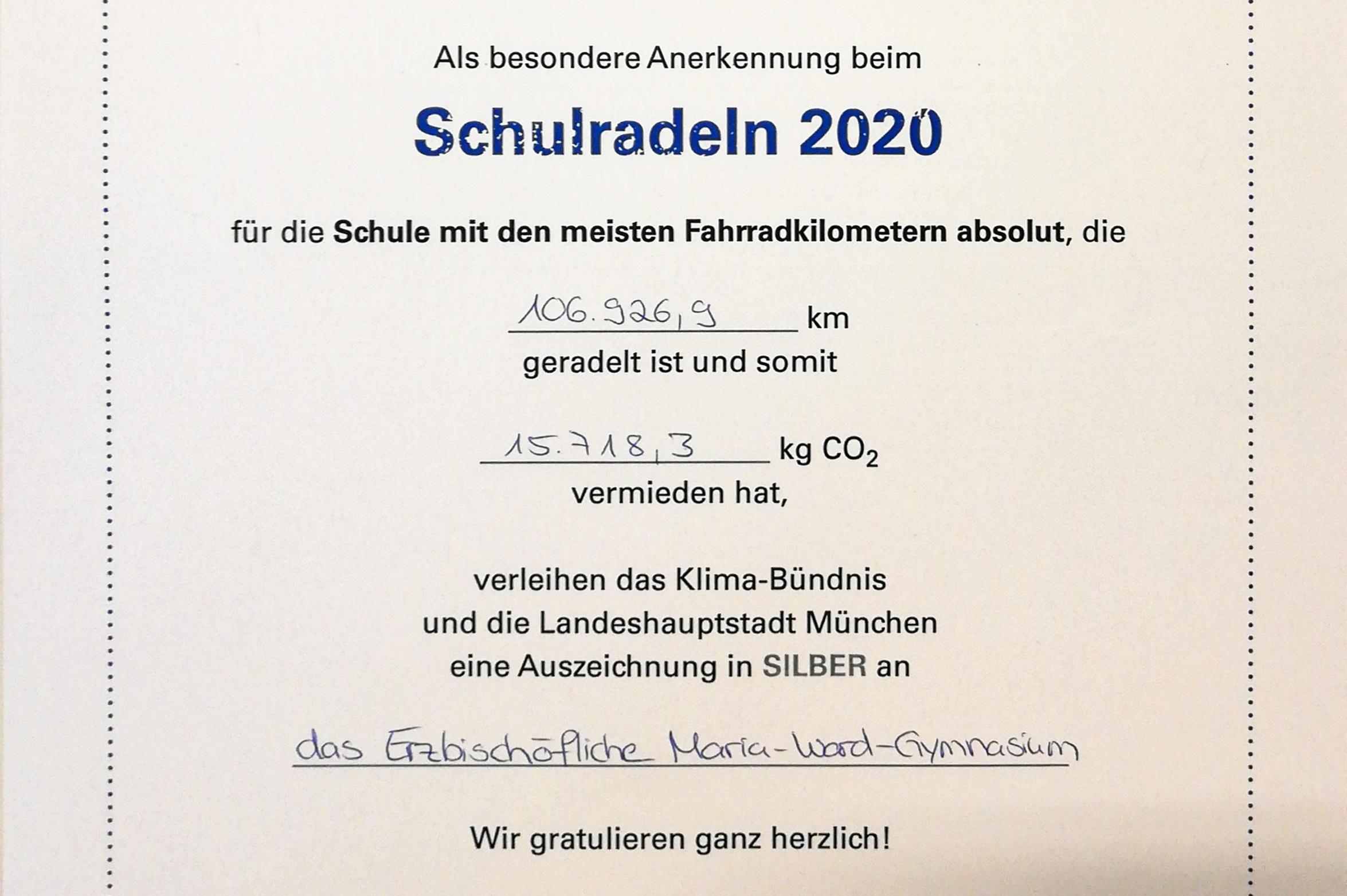 Am 25.10. ging die Aktion „Schulradeln“ zu Ende und das Ergebnis kann sich sehen lassen! Insgesamt 607 Schülerinnen, Lehrkräfte und Eltern unserer Schule haben in diesen drei Wochen 106 926,9 km erradelt und damit 15 718,3 kg CO2 eingespart! Unser Team konnte sich so den 2. Platz für die Schule mit den meisten Fahrradkilometern absolut sowie den 2. Platz für die Schule mit den meisten teilnehmenden Personen sichern. Auch wenn uns das Klenze-Gymnasium zum Schluss noch den ersten Platz vor der Nase weggeschnappt hat, sind wir dennoch sehr stolz auf diese tolle Leistung unserer Schulfamilie!
