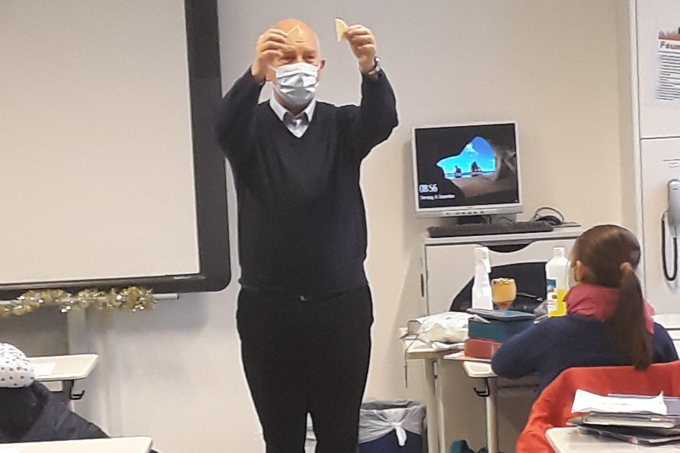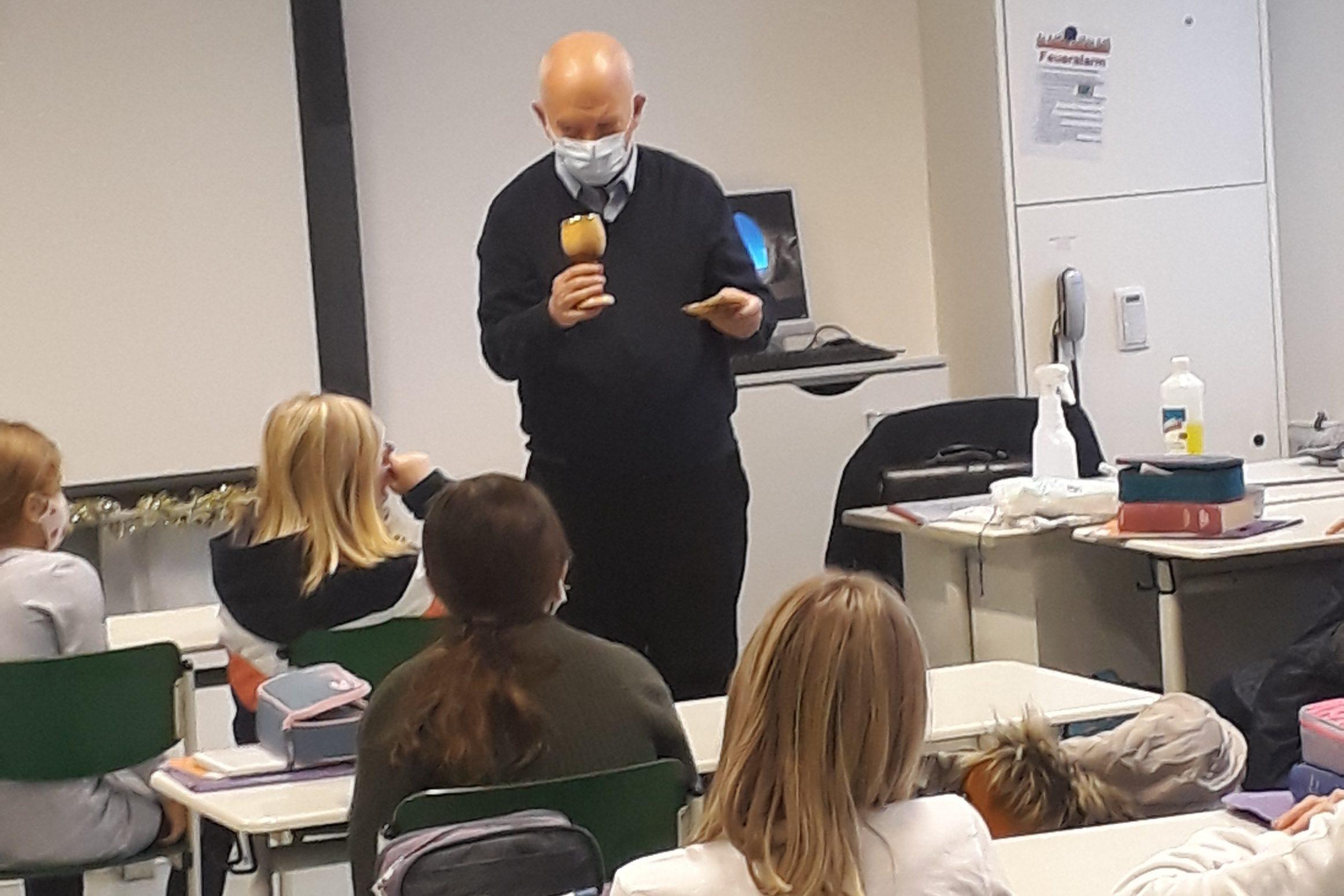 Wie bereits in vergangenen Jahren hat sich dankenswerterweise Herr Stadtpfarrer Bauer auch in Corona-Zeiten bereit erklärt, den Schülerinnen unserer fünften Klassen eine Einführung in die Geheimnisse und Feier der Hl. Messe zu geben, um am folgenden Tag im neuen Meditationsraum mit den einzelnen Klassen eine kleine Messfeier zu begehen.
