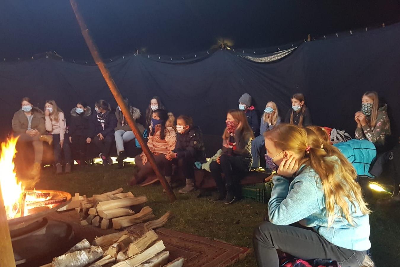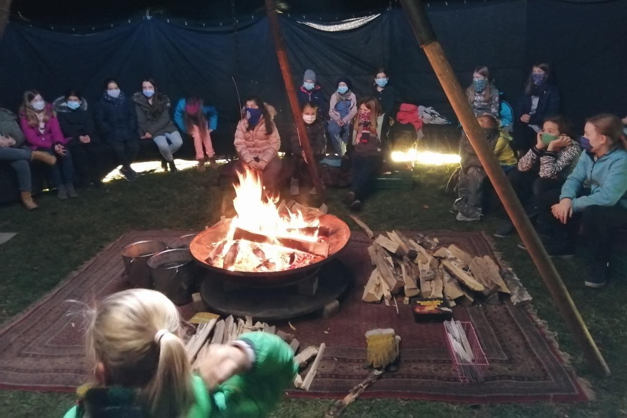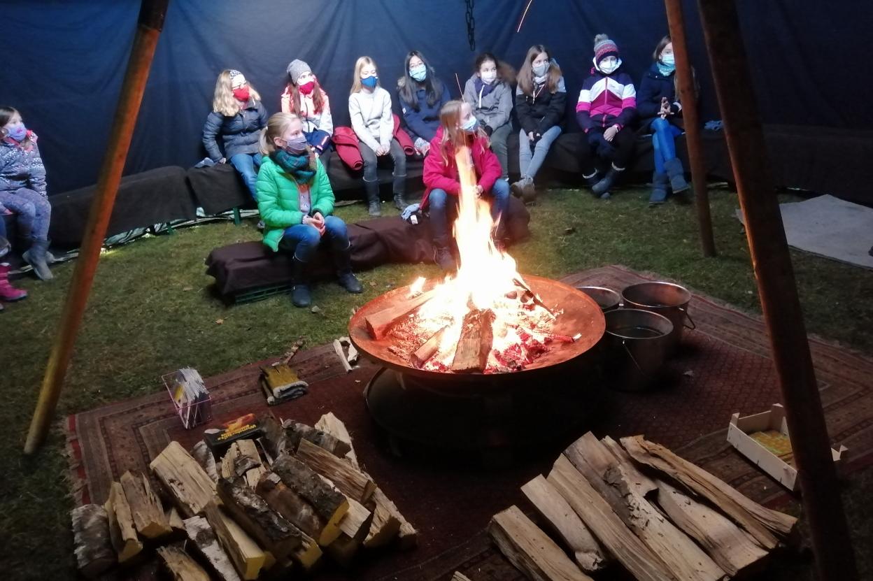 Am 14.12. 2020, kurz vor den angeordneten Schließungen der Schulen in Bayern, durften die Schülerinnen unserer fünften Klassen noch ein besonderes vorweihnachtliches Highlight am Maria-Ward-Gymnasium erleben. Im großen dunklen Zelt, nur begleitet vom Knistern des Lagerfeuers und von vereinzelten „märchenhaften“ Klängen der Hapi, lauschte man Märchenerzähler Matthias Fischer aus Augsburg, der die Augen der jungen Schülerinnen mit seinen vielseitigen und detaillierten Beschreibungen zum Leuchten und gleichzeitig zum Nachdenken brachte. So hörten die Schülerinnen u.a. vom Pärchen Jack und Della aus Chicago, die zur Zeit der Wirtschaftskrise in den USA lebten und unter materieller Not litten. Trotzdem möchten die beiden am Weihnachtsfest dem jeweils anderen etwas ganz Besonderes schenken, sodass sie mit der Uhr des Urgroßvaters bzw. den schönsten goldenen Haaren der Stadt ihren wichtigsten „Besitz“ eintauschen, um am Ende festzustellen, dass das größte Geschenk ist, füreinander da sein zu können. „Echte Geschenke erhält man nicht unbedingt durch Kostspieligkeiten, sondern findet man im Herzen“, erklärte Fischer dazu passend mit Blick auf das anstehende Weihnachtsfest. Für viele Lacher sorgte dagegen eine moderne Weihnachtserzählung, bei der unzählige Tiere – vom Maus über ein Wildschwein bis zum Bären – in einem verlorenen Handschuh versuchen, Schutz vor der Kälte zu finden. Zum Platzen bringt den Handschuh aber mit der Ameise ausgerechnet das letzte und kleinste Wesen.