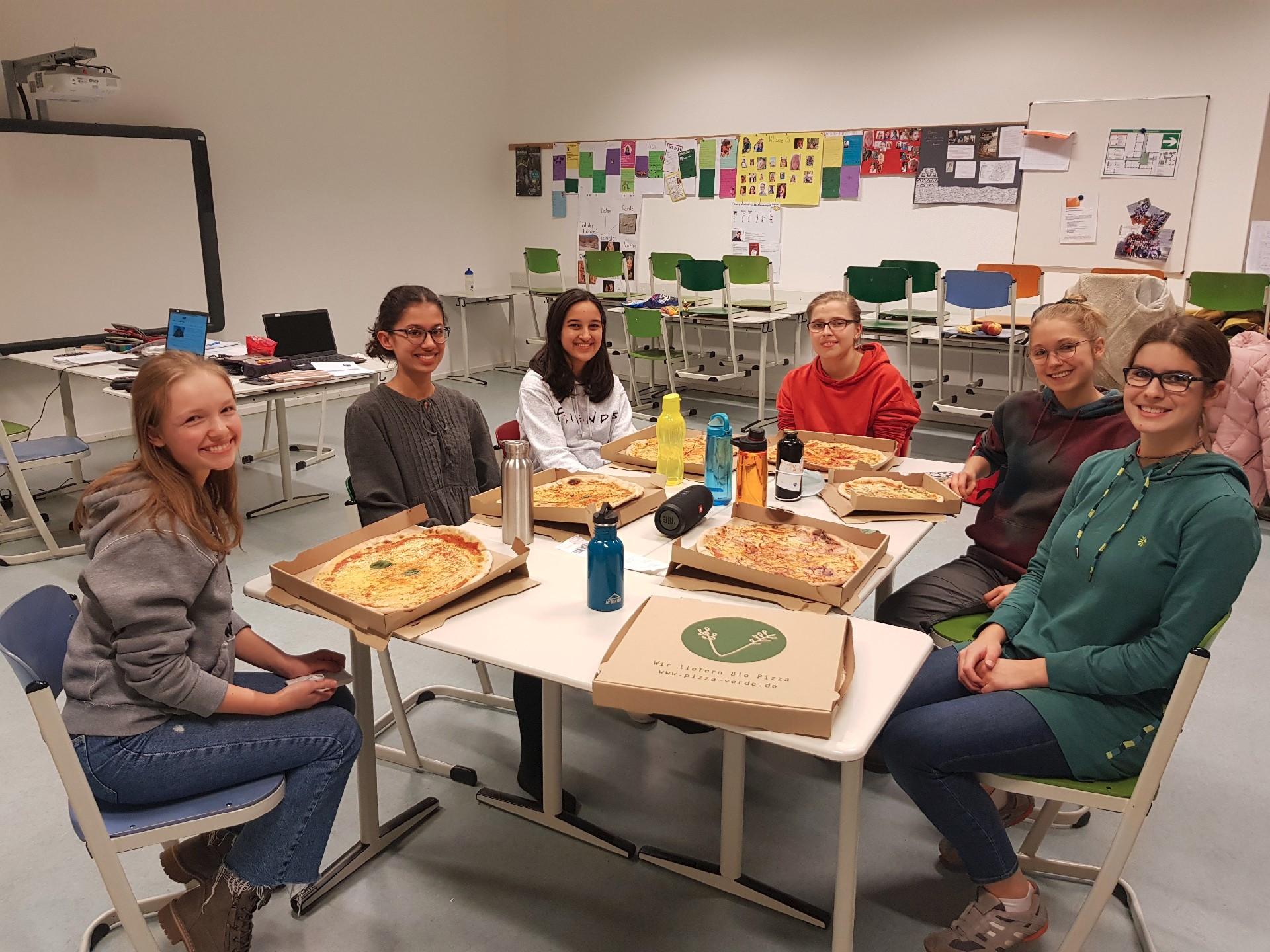 Am Freitagabend trafen wir uns also an der Schule und haben uns eingerichtet und angefangen zu knobeln. Unterbrochen wurden wir dann durch die Pizza und danach ging es wieder fleißig weiter. Gegen 11 Uhr abends bekamen wir Besuch von Ronja, die uns den Wettbewerb vorgeschlagen hatte und dann mit uns gemeinsam an den Aufgaben gerätselt hat. Gegen 3 Uhr nachts hatten wir dann die erste Runde beendet und kamen erfolgreich in die zweite Runde. In die dritte Runde schafften wir es dann leider nicht mehr, jedoch hatten wir alle unglaublich viel Freude an dem Wettbewerb und es war eine großartige Erfahrung! Zwischendrin haben wir natürlich mehrere Pausen gemacht, in denen wir uns entspannt bzw. abgelenkt haben und viel Spaß zusammen hatten. Gegen halb 5 Uhr nachts haben wir uns dann doch zum Schlafen hingelegt und noch dreieinhalb Stunden geschlafen, bis um 8 Uhr wieder der Wecker geklingelt hat. Dann hat Frau Schultes uns sogar Croissants vom Bäcker geholt und wir haben noch gemeinsam gefrühstückt. Insgesamt war es ein sehr schönes Erlebnis, was wir nächstes Jahr auf jeden Fall wiederholen wollen! Vielleicht ist es bis dahin schon wieder möglich etwas Jahrgangsübergreifendes zu organisieren…