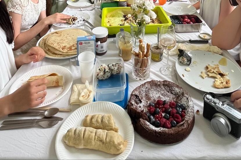 Aufgrund des unbeständigen Wetters konnte das Dîner nicht wie ursprünglich geplant im Freien stattfinden. Stattdessen wurde daher im Gang des ersten Stockwerks eine lange, imposante weiße Tafel aufgebaut, welche den gesamten Gang ausfüllte. Schülerinnen aus allen Jahrgangsstufen kamen zusammen, dekorierten ihre Tische mit weißen Tischdecken, Blumen und Kerzen und genossen ihre mitgebrachten Speisen: Käse, Wurst, Baguette, verschiedene Salate, Obst, Crêpes, Quiche, Muffins, Kuchen – es blieben keine Wünsche offen.