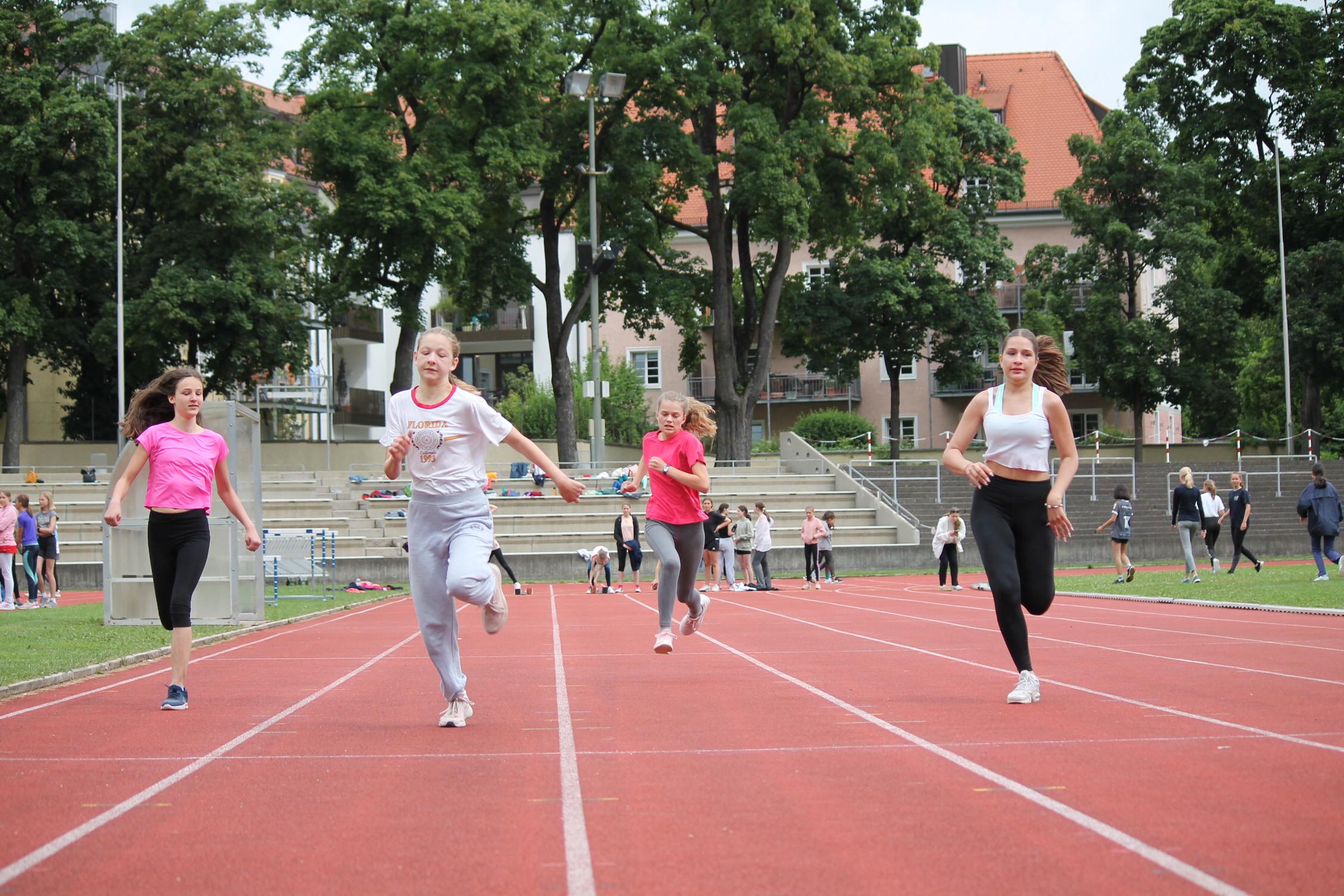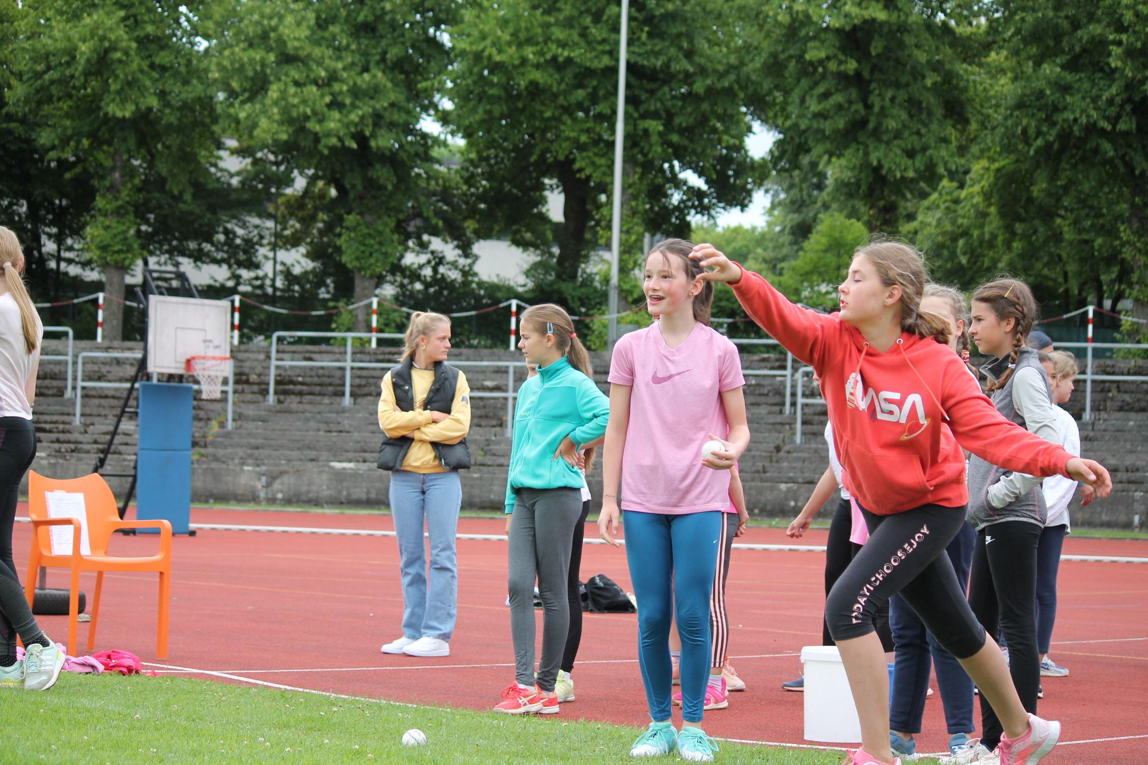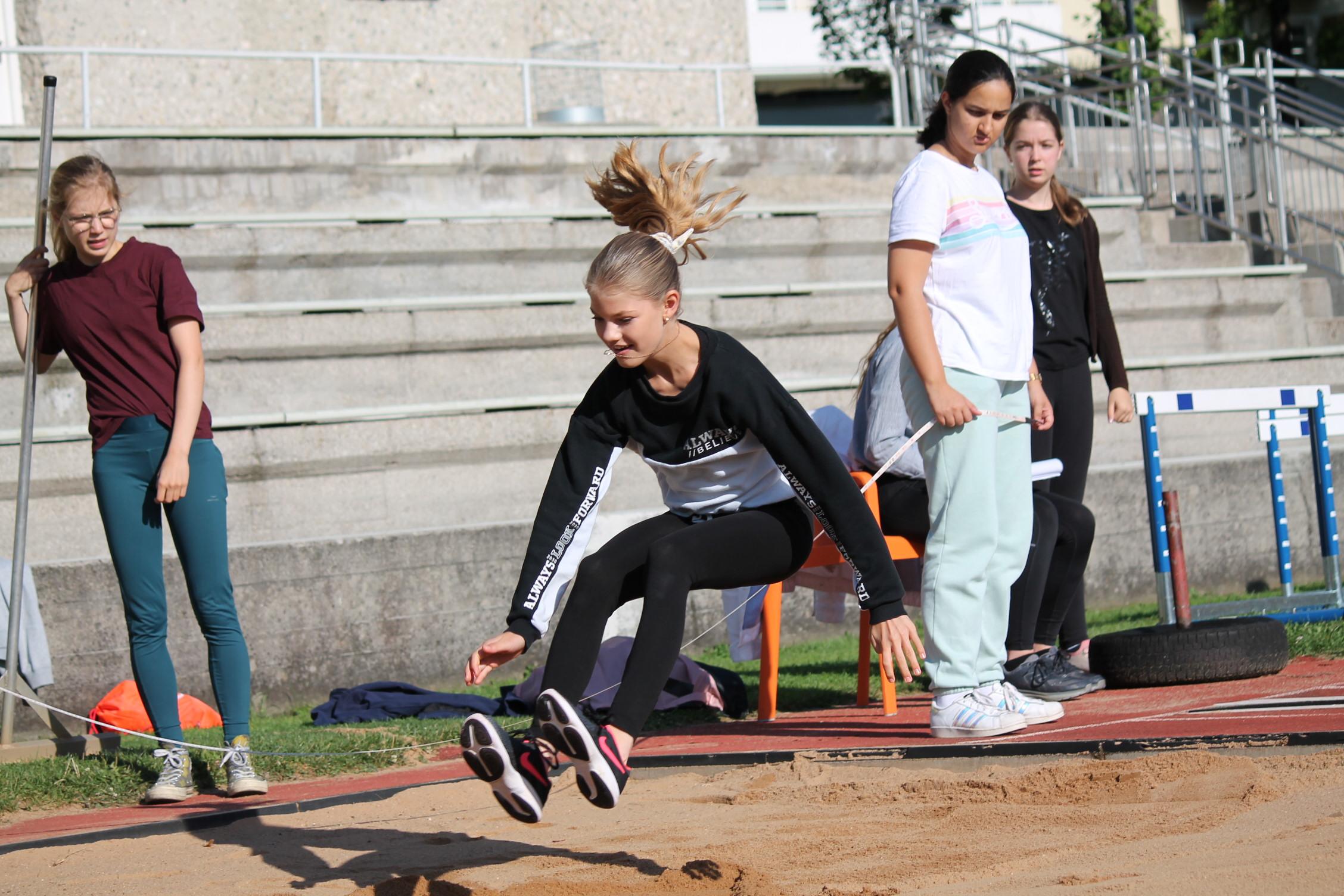 Bei den Bundesjugendspielen messen sich die Schülerinnen in drei Disziplinen Lauf (50m oder 75m je nach Alter), Wurf (80g oder 200g Ball) und Weitsprung.