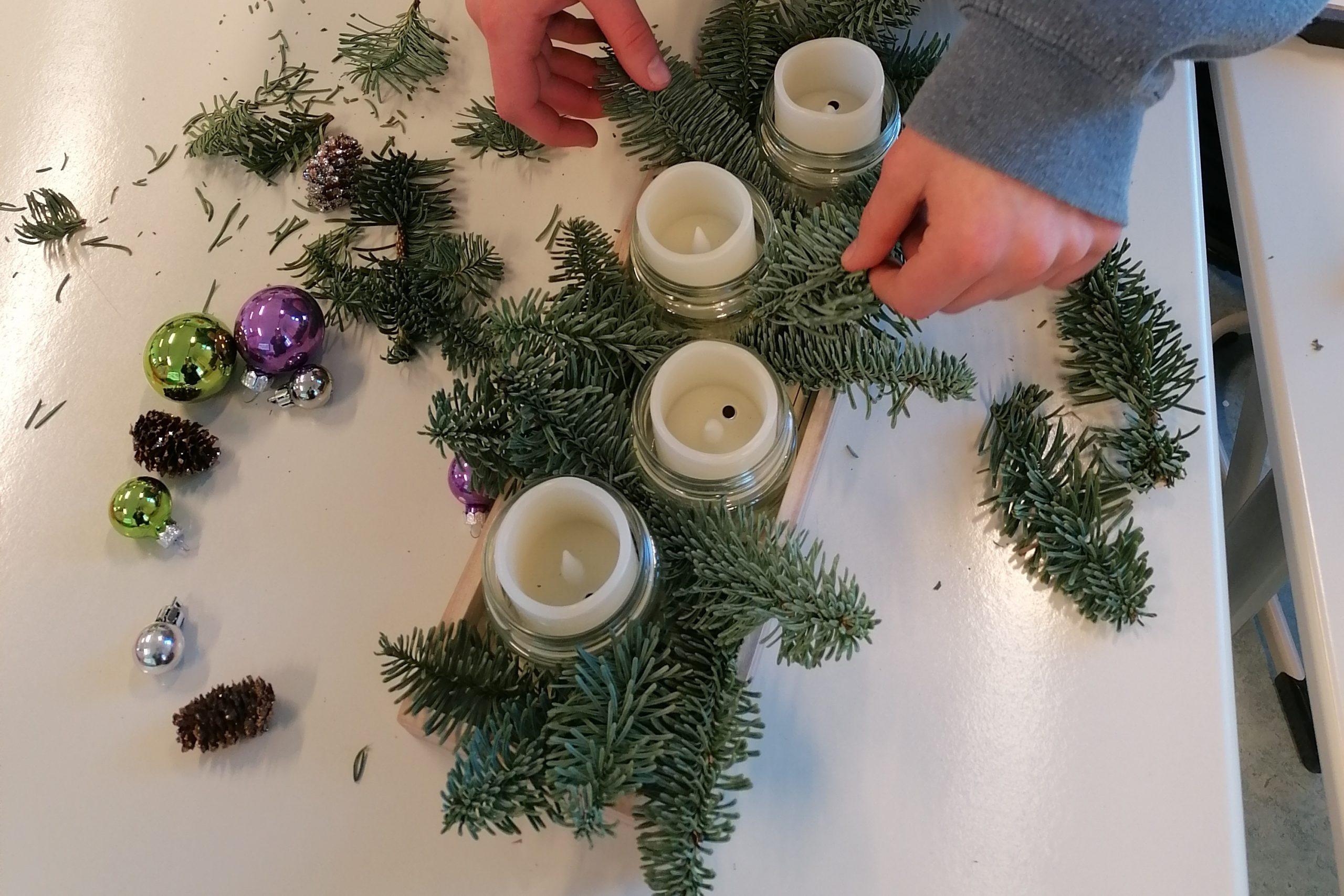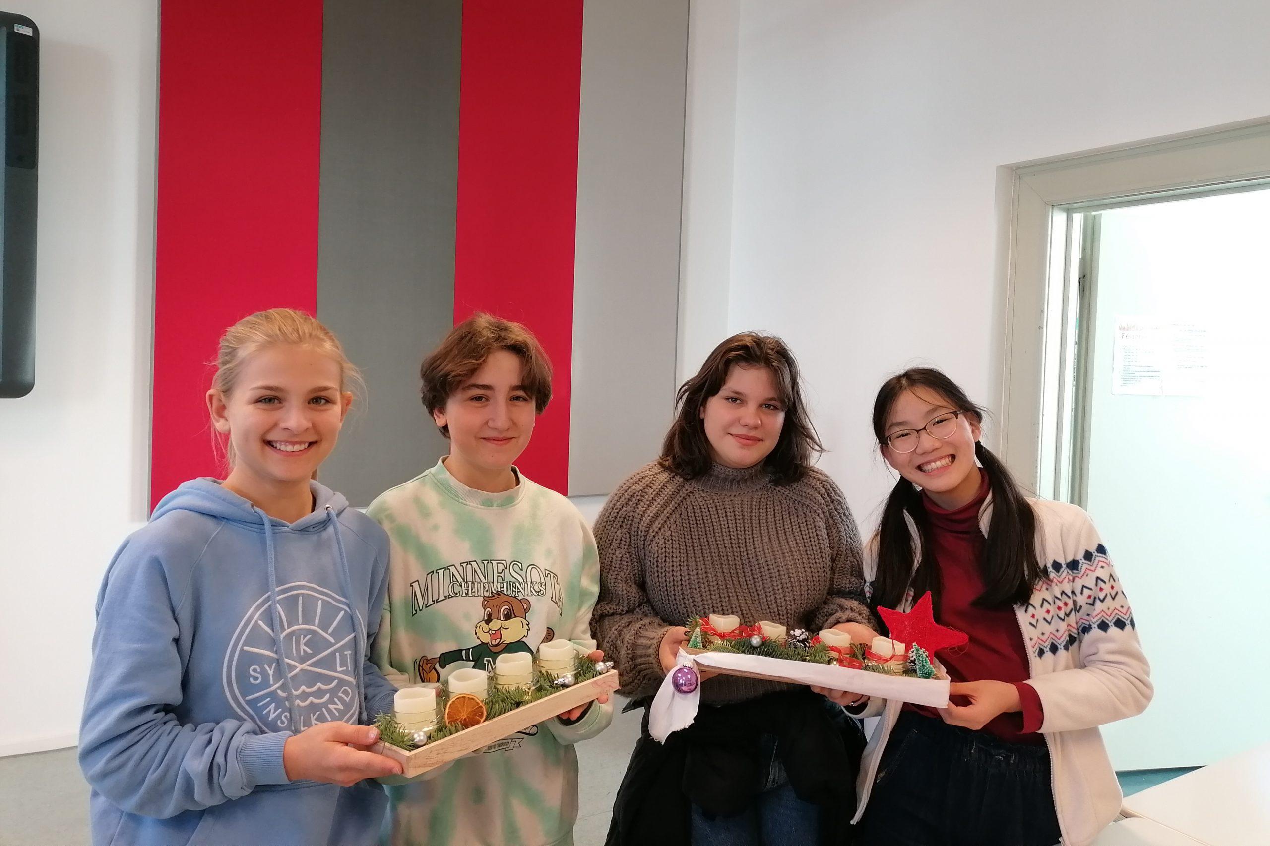 Da im letzten Jahr die selbstgemachten Adventsgestecke die ganze Schule in Weihnachtsstimmung tauchten, haben wir sie dieses Jahr am 23. November wieder mit allen Klassensprecherinnen mit frischen Zweigen, Zapfen und Kerzen bestückt. Rund 25 Adventsgestecke dekorierten daraufhin den Großteil der Klassenzimmer.