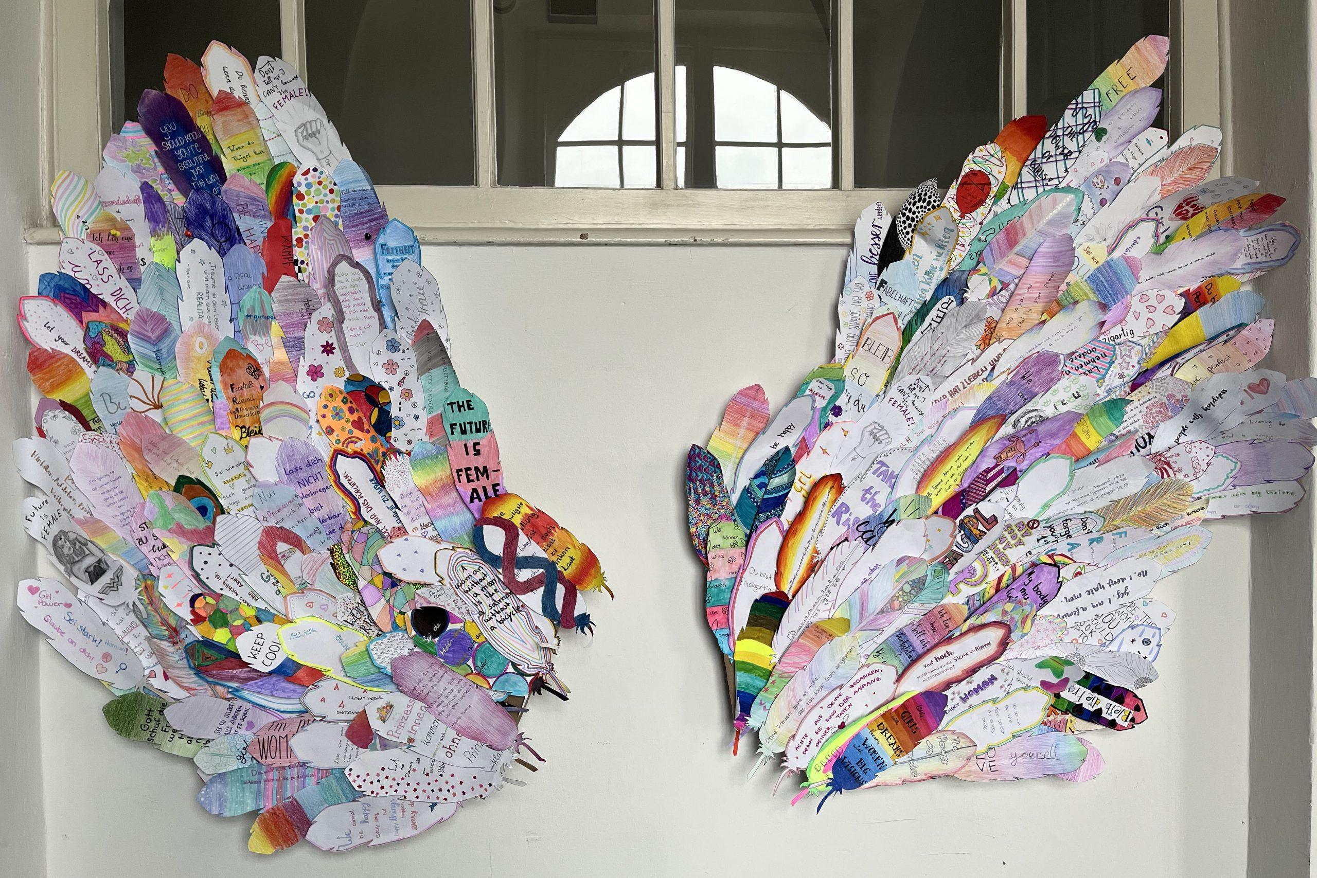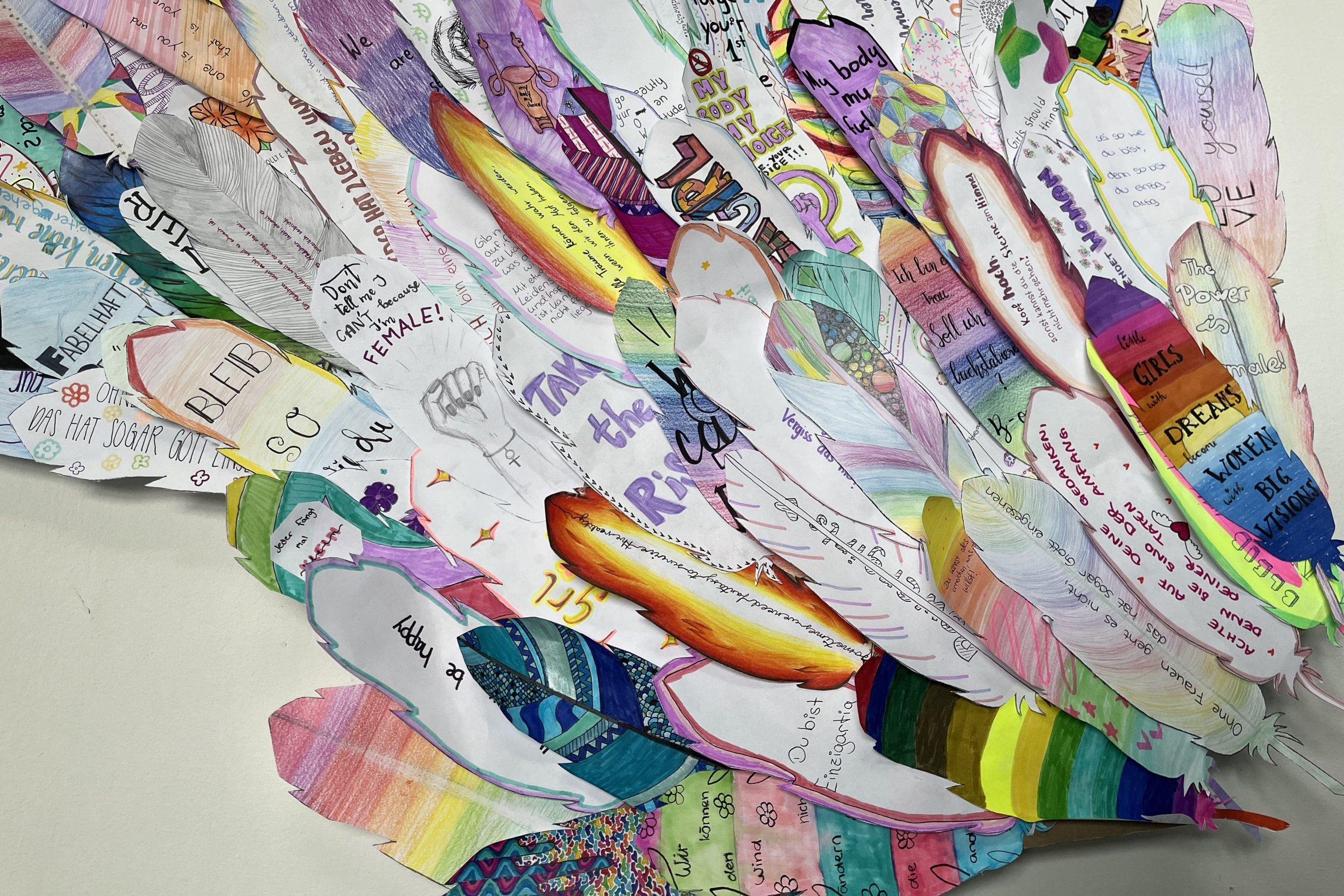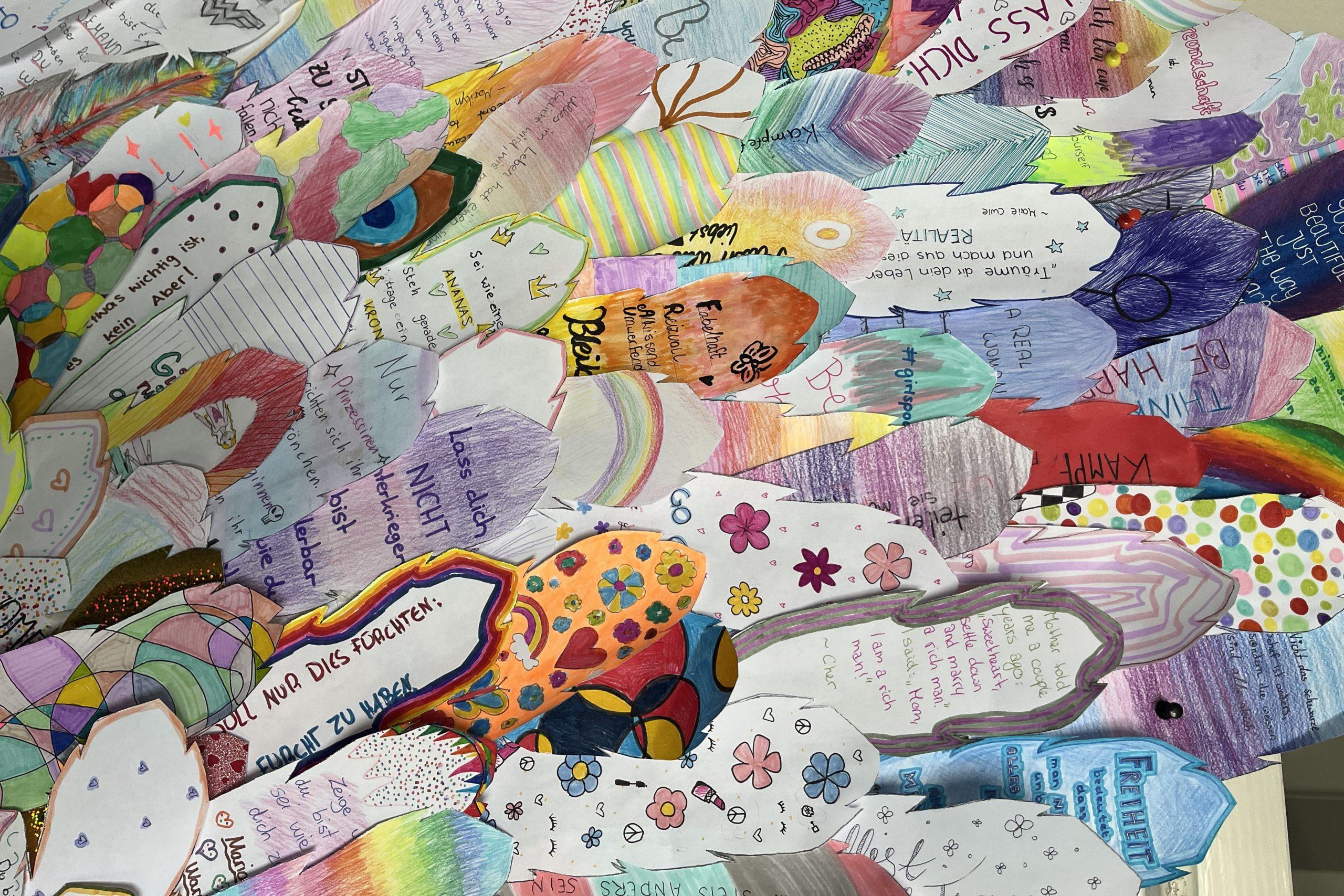 Schülerinnen aller Klassen des MWG gestalteten dazu individuelle Federn mit Botschaften, die ermutigen und stark machen und zusammen ergeben die einzelnen Federn einen großen Flügel.