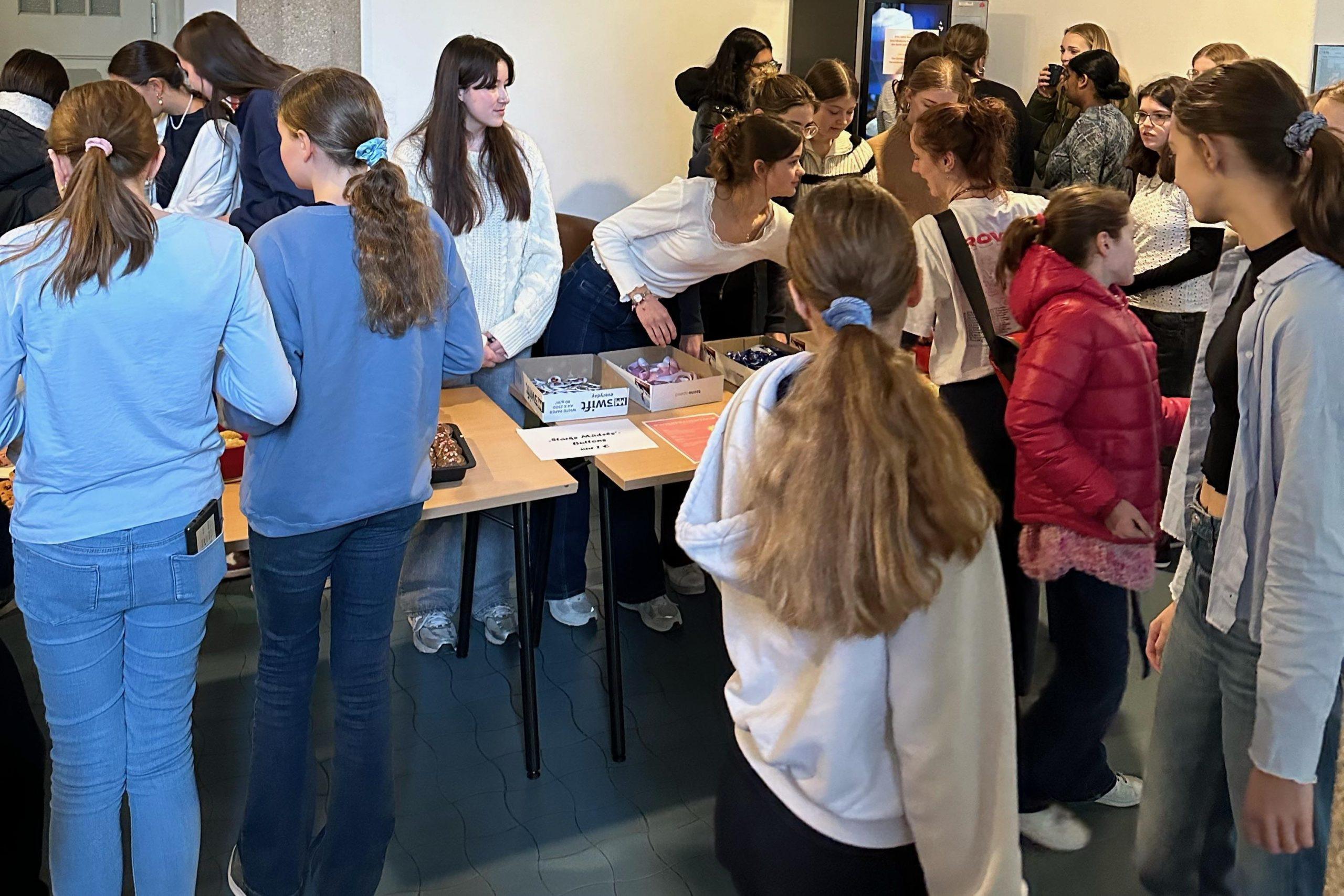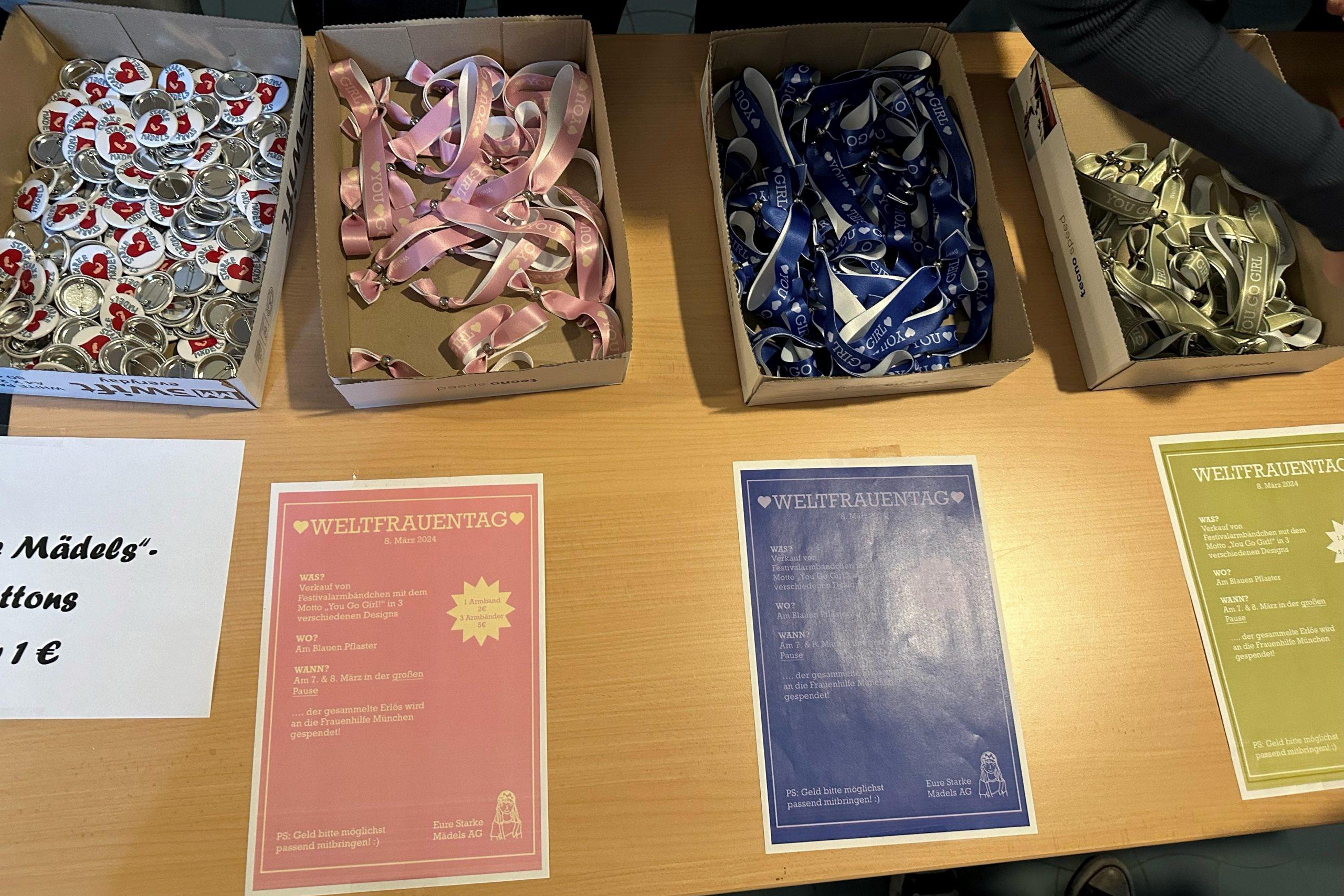 Um sich selbst oder auch anderen tollen Frauen eine Freude zu machen, konnte man Armbänder bei der AG Starke Mädels erwerben. Diese gab es in drei verschiedenen Farben zu kaufen mit der motivierenden Aufschrift „you go girl!“ Und der Armbänderverkauf war der absolute Erfolg – es wurden alle Armbänder verkauft! Somit sind wir sehr stolz euch zu verkünden, dass wir die Summe von 850€ an die Frauenhilfe München spenden konnten! Unter www.frauenhilfe-muenchen.de erfahrt ihr mehr über diese wichtige Organisation unserer Stadt.