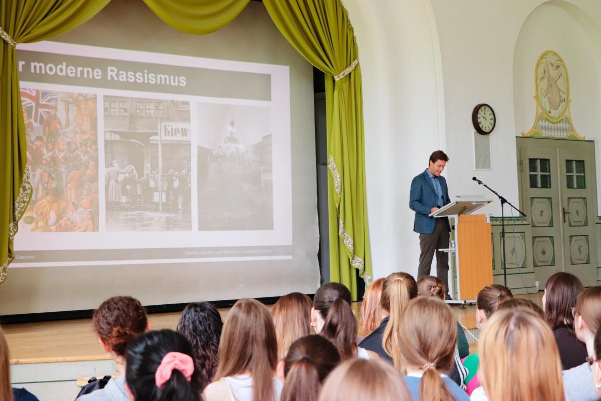 Seit einigen Jahren hält Professor Florian Gassner von der University of British Columbia im kanadischen Vancouver Vorträge an Schulen in Oberbayern. Dabei geht es um die Beantwortung der Frage „Wie funktioniert Antisemitismus?“. Dafür verwendet Herr Gassner die Semesterferien seiner kanadischen Bildungseinrichtung, um in seiner bayerischen Heimat über dieses wichtige und leider aktuelle Thema Jugendliche gut zu informieren und ihnen auch Wege aufzuzeigen, sich gegen antisemitische Narrative zu positionieren. Am 13.06. 2024 war er bei uns am Maria-Ward-Gymnasium. In der Aula. Für die Mädchen der zehnten und elften Klassen.