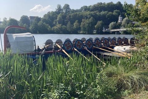 Am 18.September 2024 sind wir mit dem Zug nach Regensburg und dort mit dem Bus zur Regen gefahren. Dann mussten nur noch einen Marsch von zwei Minuten antreten. Als wir angekommen waren, haben wir gesehen, mit welchem Gefährt wir über die Regen fahren werden: Es war ein an der Universität Regensburg nachgebautes Römerschiff. Mit diesem fahren schon seit 20 Jahren Schulklassen, Touristengruppen und viele mehr auf der Regen.