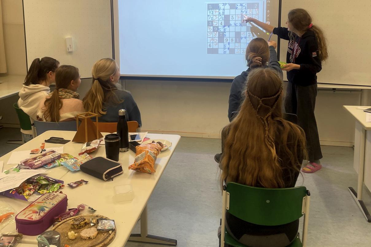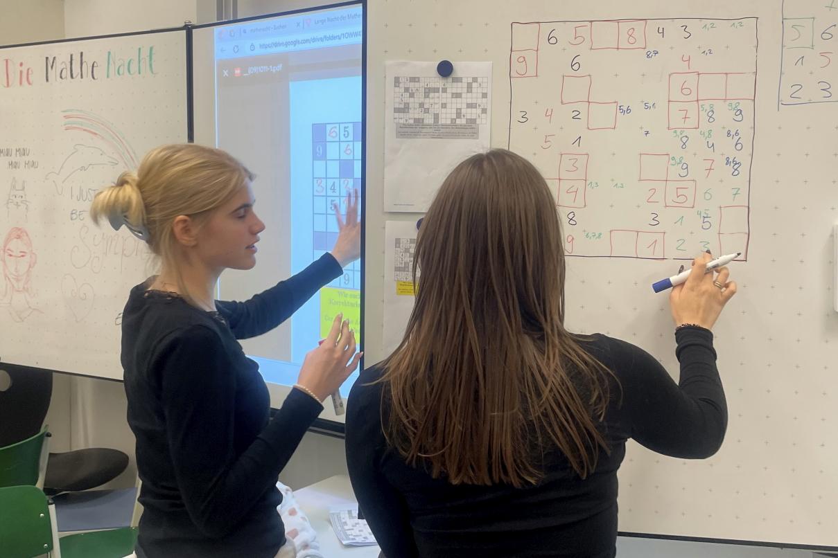 Die ganze Nacht über hörte man auf den Fluren eifriges Gemurmel. Es wurde gerechnet, diskutiert und an Tafeln und Blättern gearbeitet. Die Mathelehrerinnen und -lehrer kamen immer wieder vorbei, um Tipps zu geben und die Teams zu unterstützen. Zwischendurch gab es Snacks und Getränke vom Buffet, die für neue Energie sorgten.