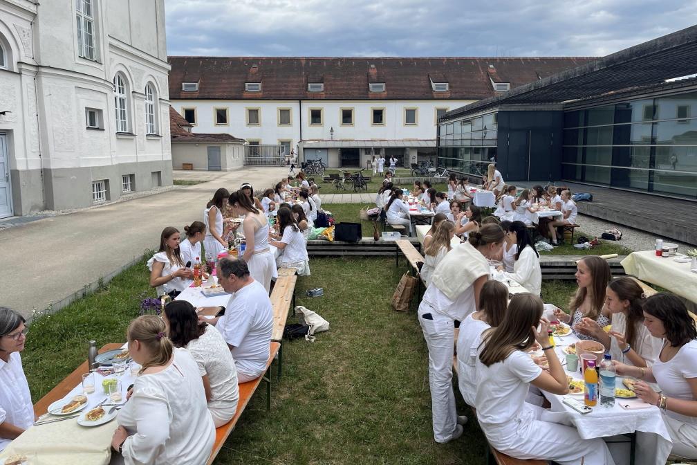 Endlich war es wieder soweit! Wie immer am Schuljahresende versammelten sich am 1. Juli 2025 viele Französischschülerinnen und Lehrkräfte – alle weiß gekleidet und bepackt mit feinstem Essen – um nach französischem Vorbild in weiß – en blanc – zu dinieren.